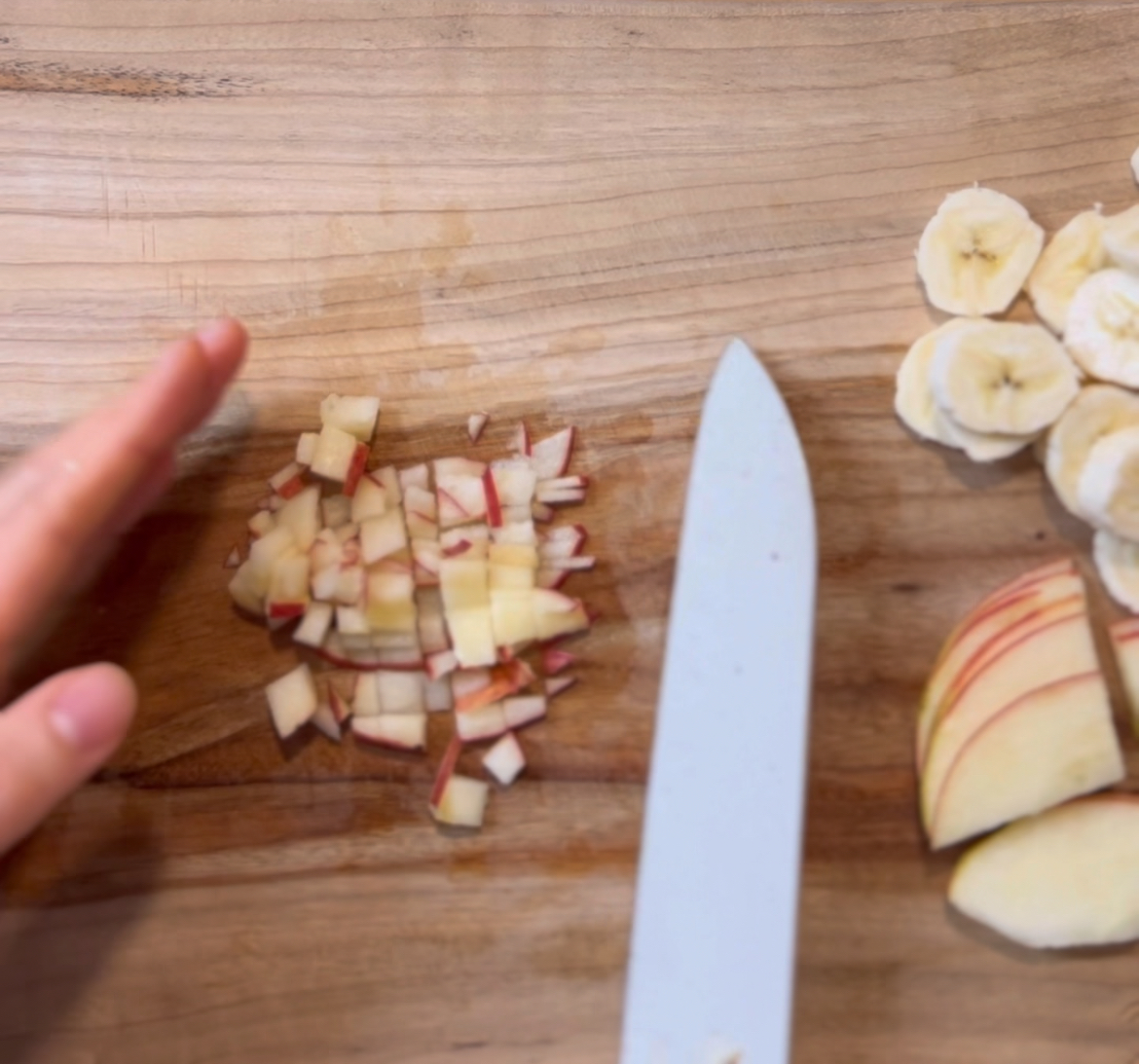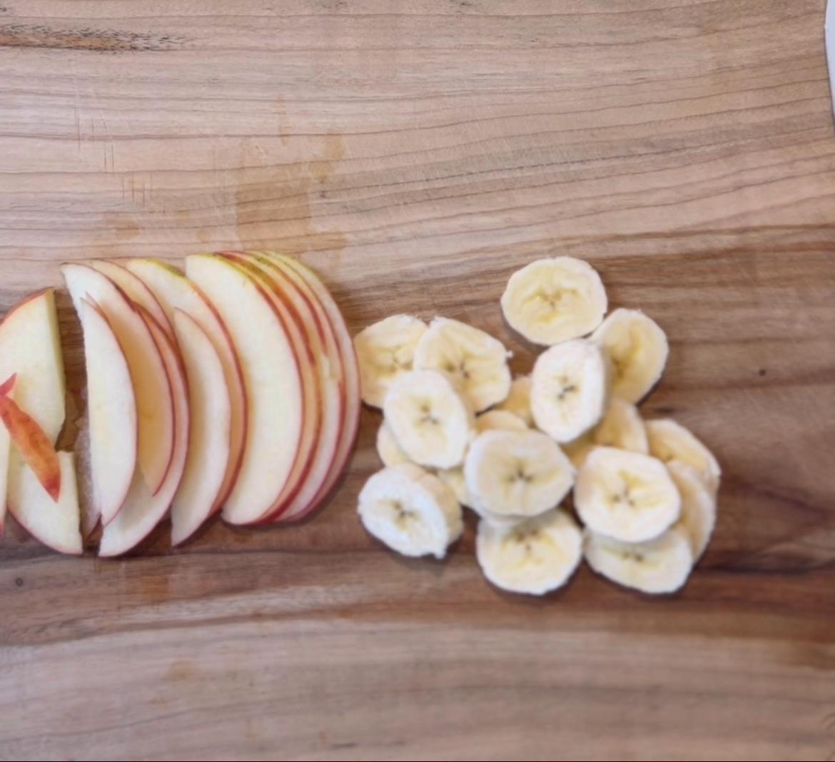 토핑용 바나나 1개, 사과한쪽 슬라이스 해줍니다