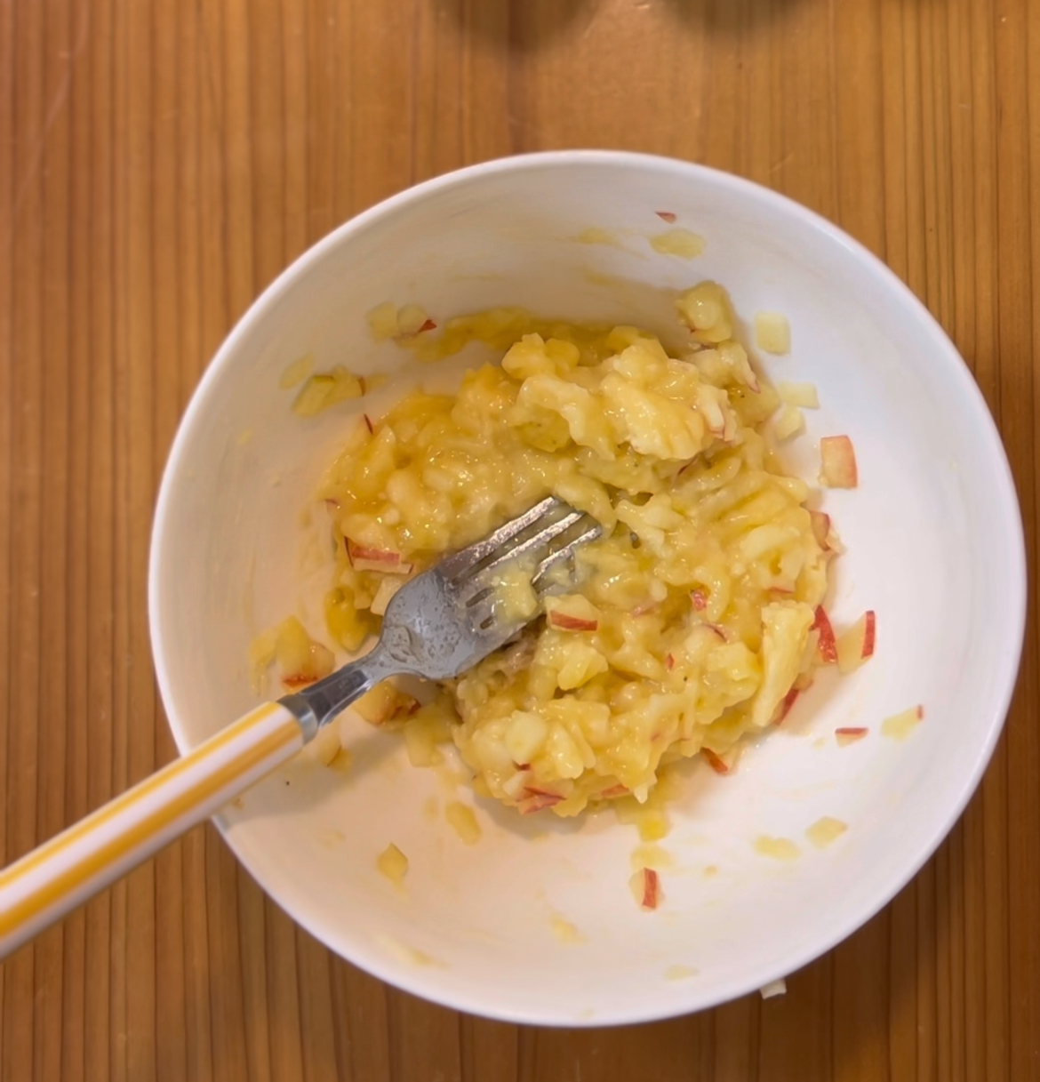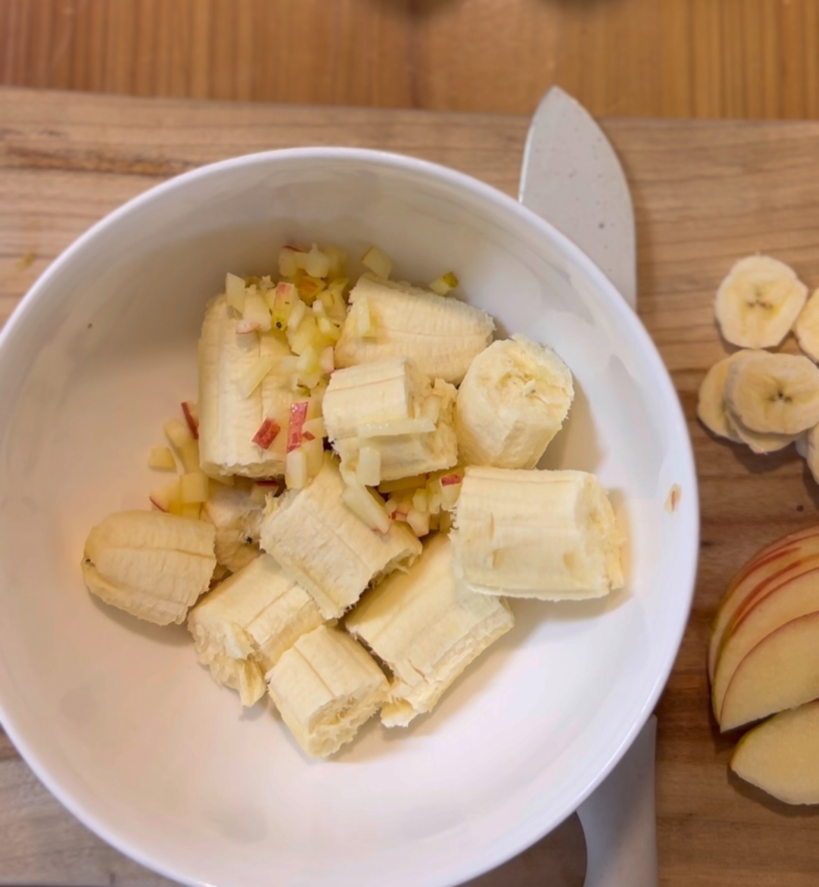 2. 다진 사과와 바나나 2개 볼에 담고 으깨어 줍니다