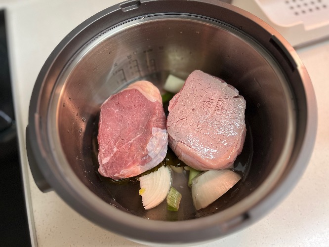 고기삶은 육수 500ml에 고기, 버섯,