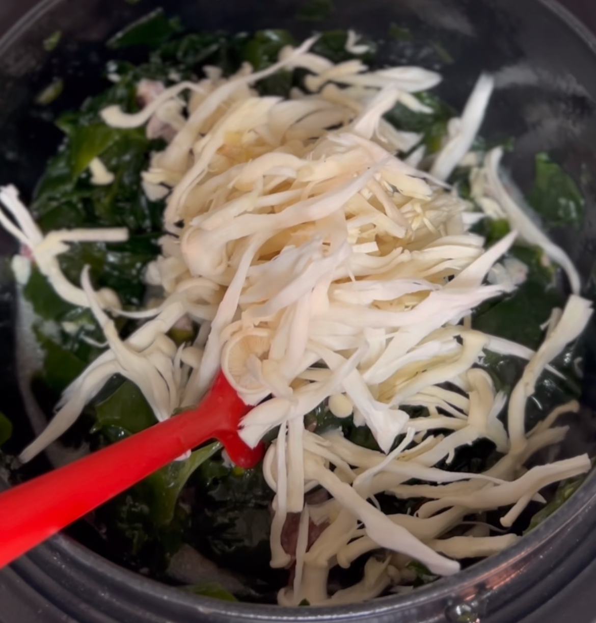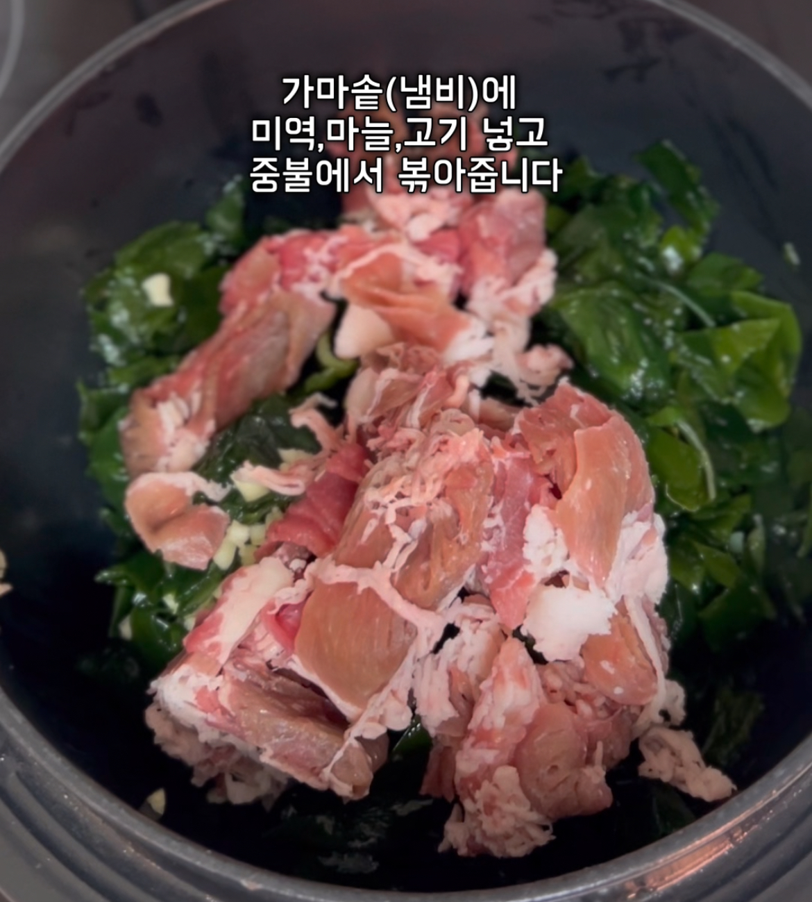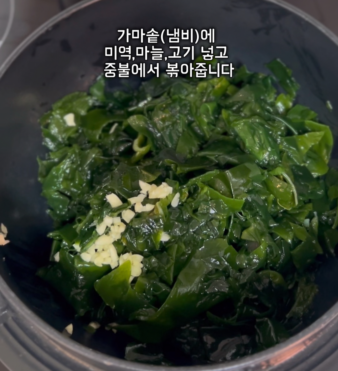 가마솥(냄비)에 미역, 마늘, 고기 넣고