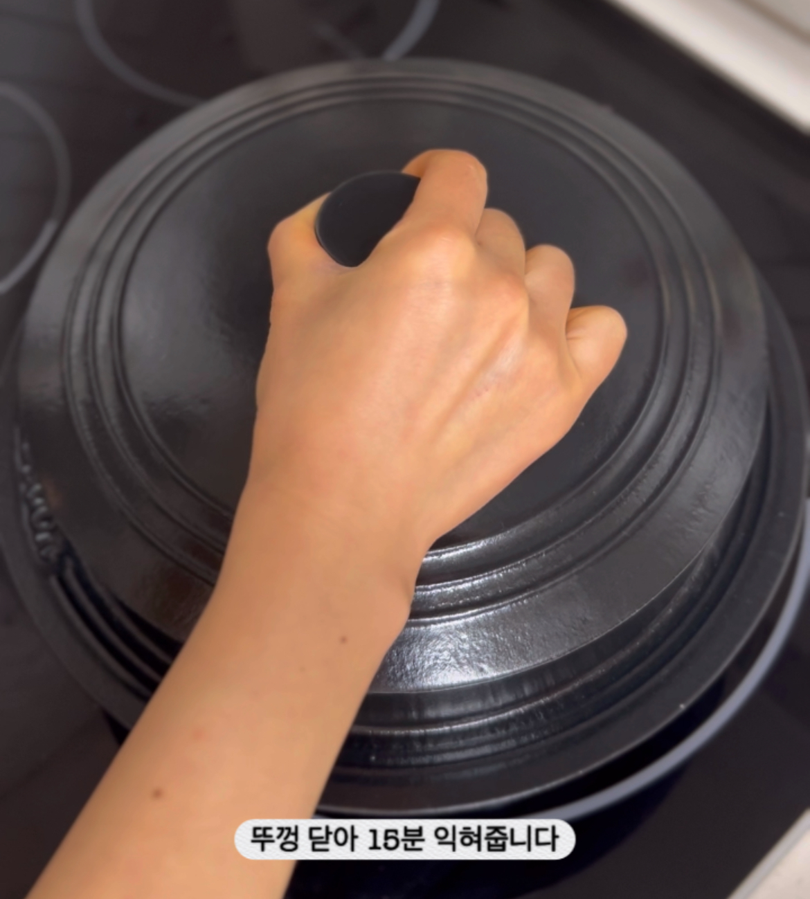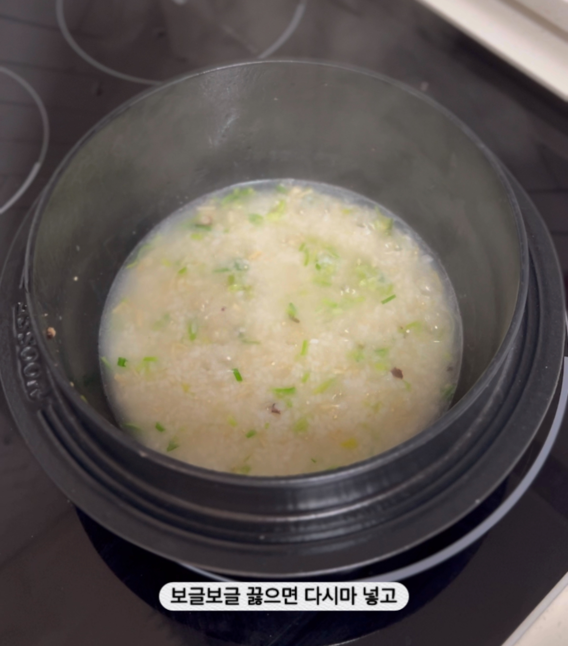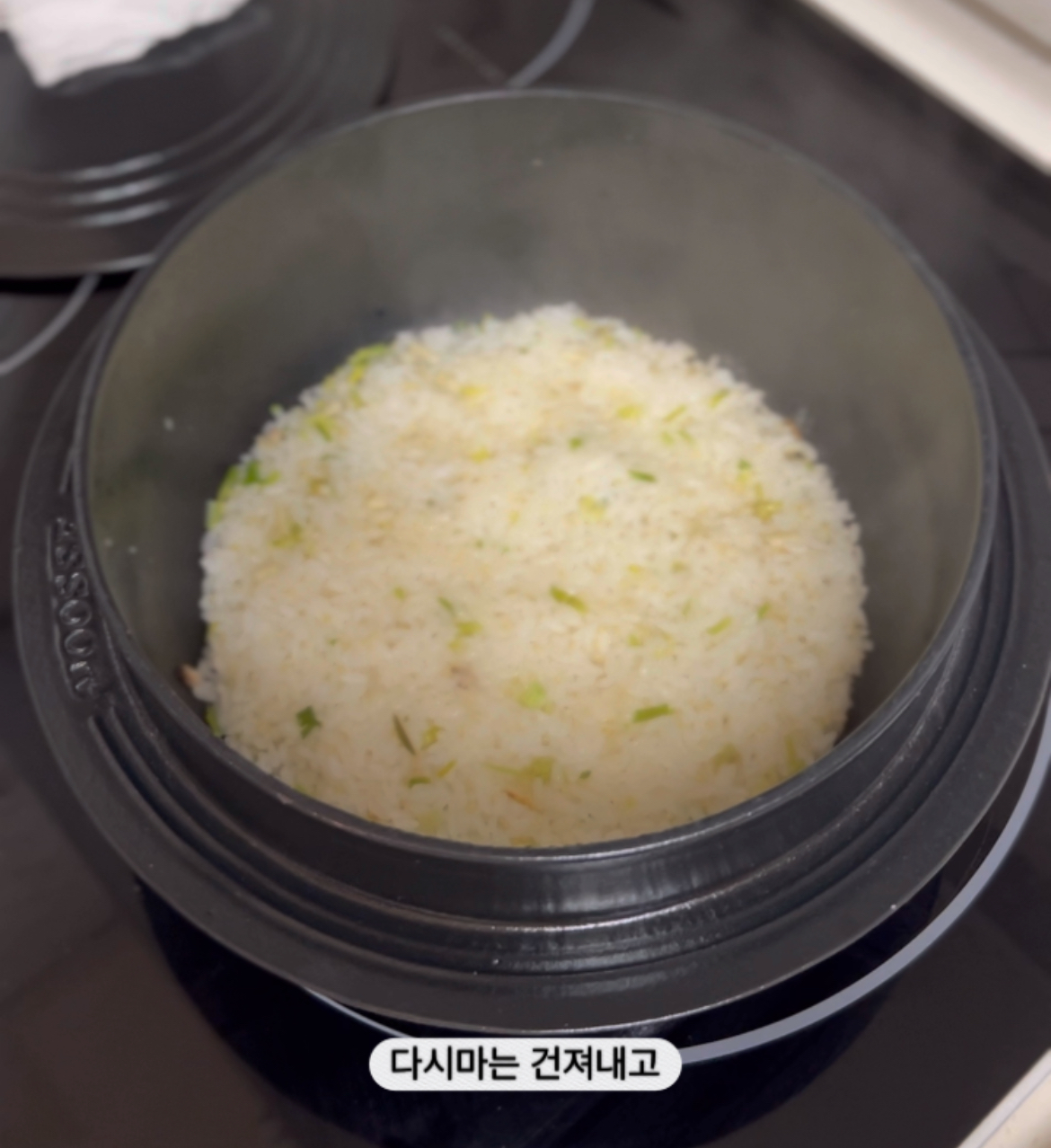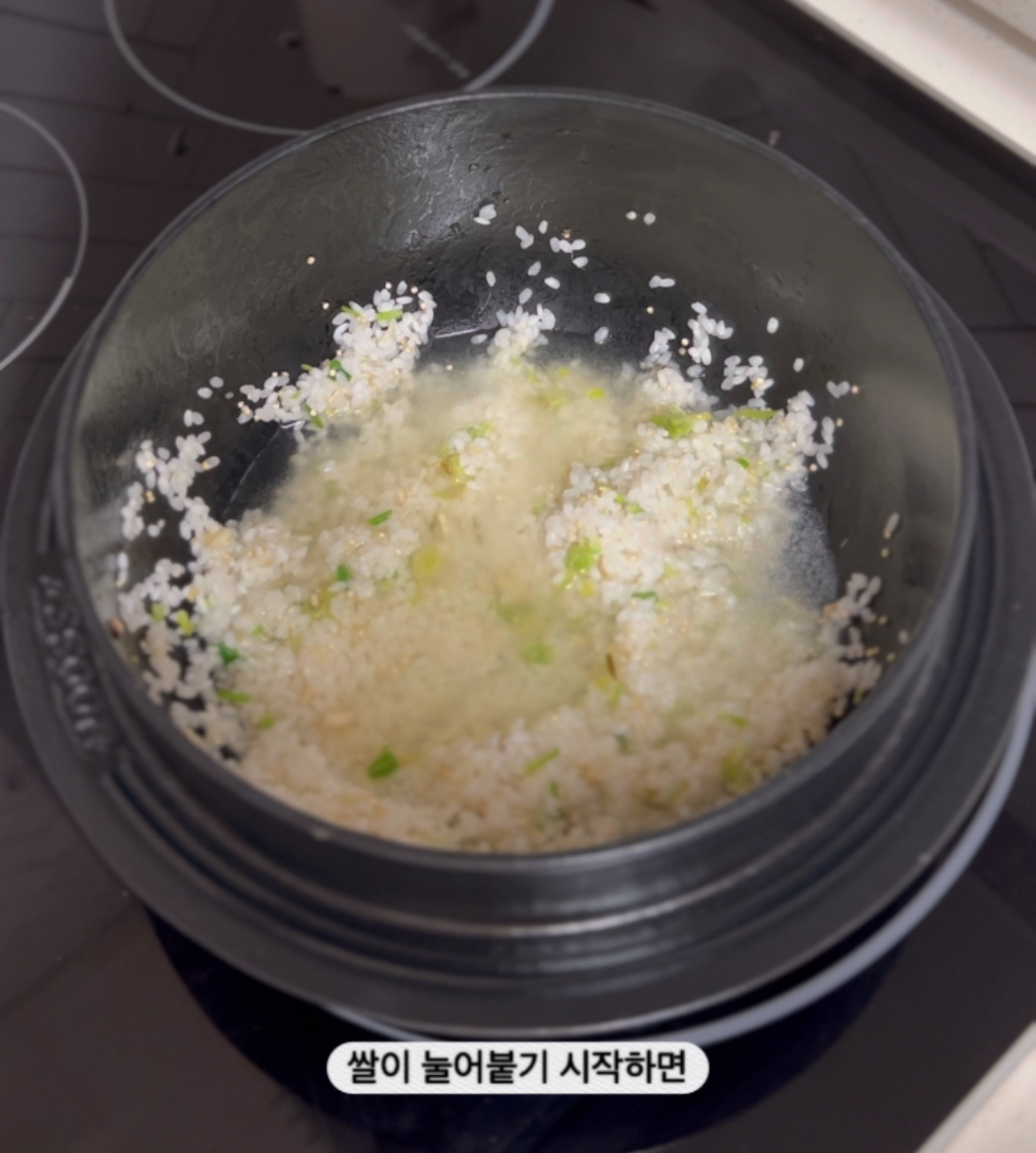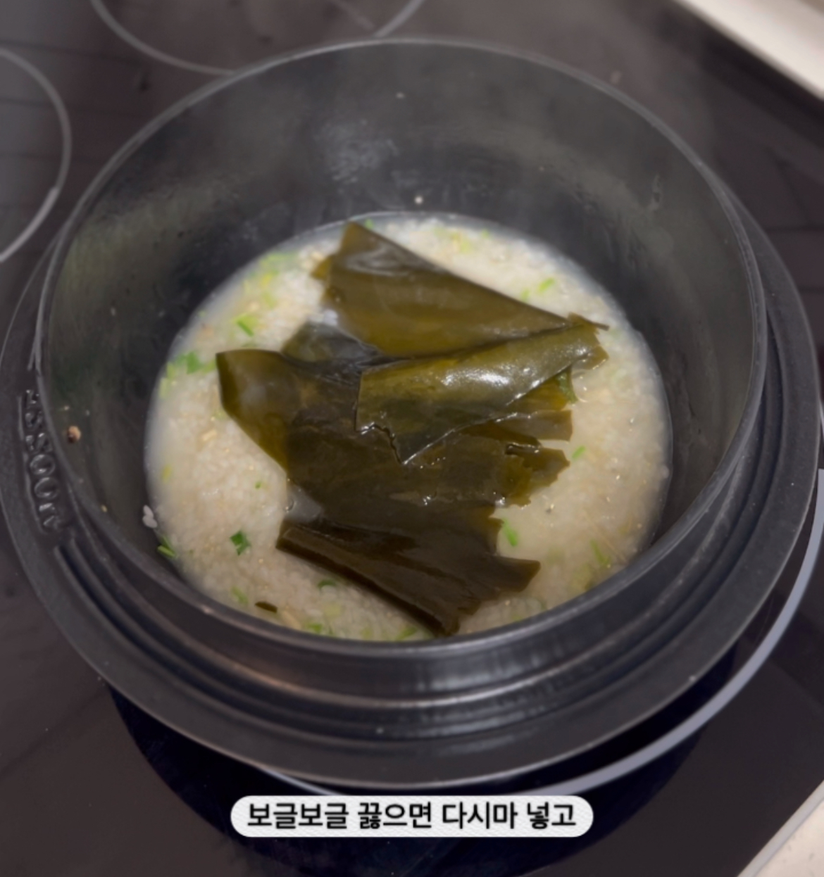 쌀이 눌어붙기 시작하면 다시마 우리물 넣고 중강불 올려 보글보글 끓으면 다시마넣고 뚜껑닫아 15분 익혀줍니다