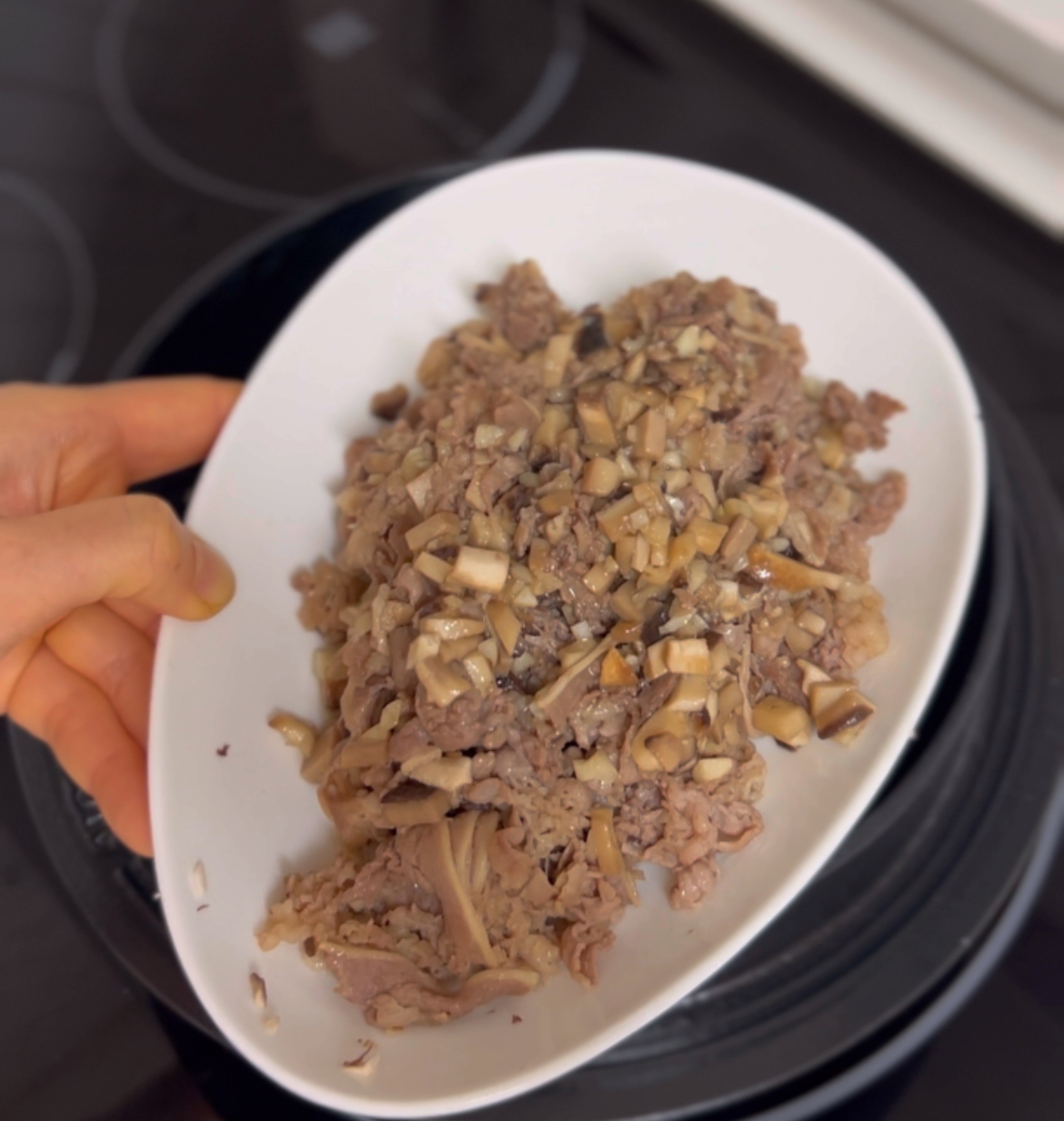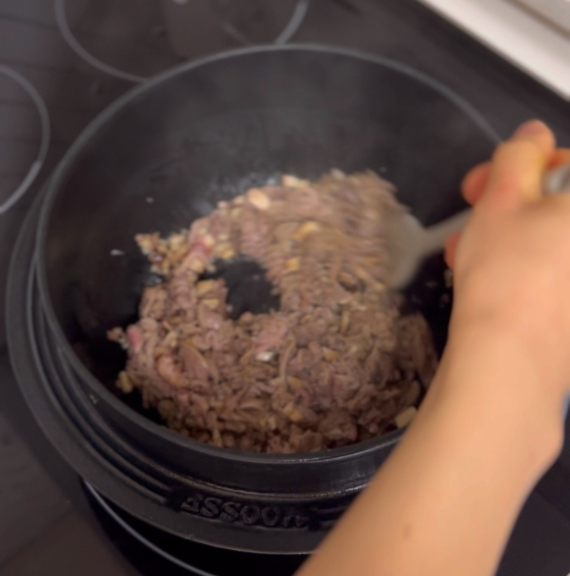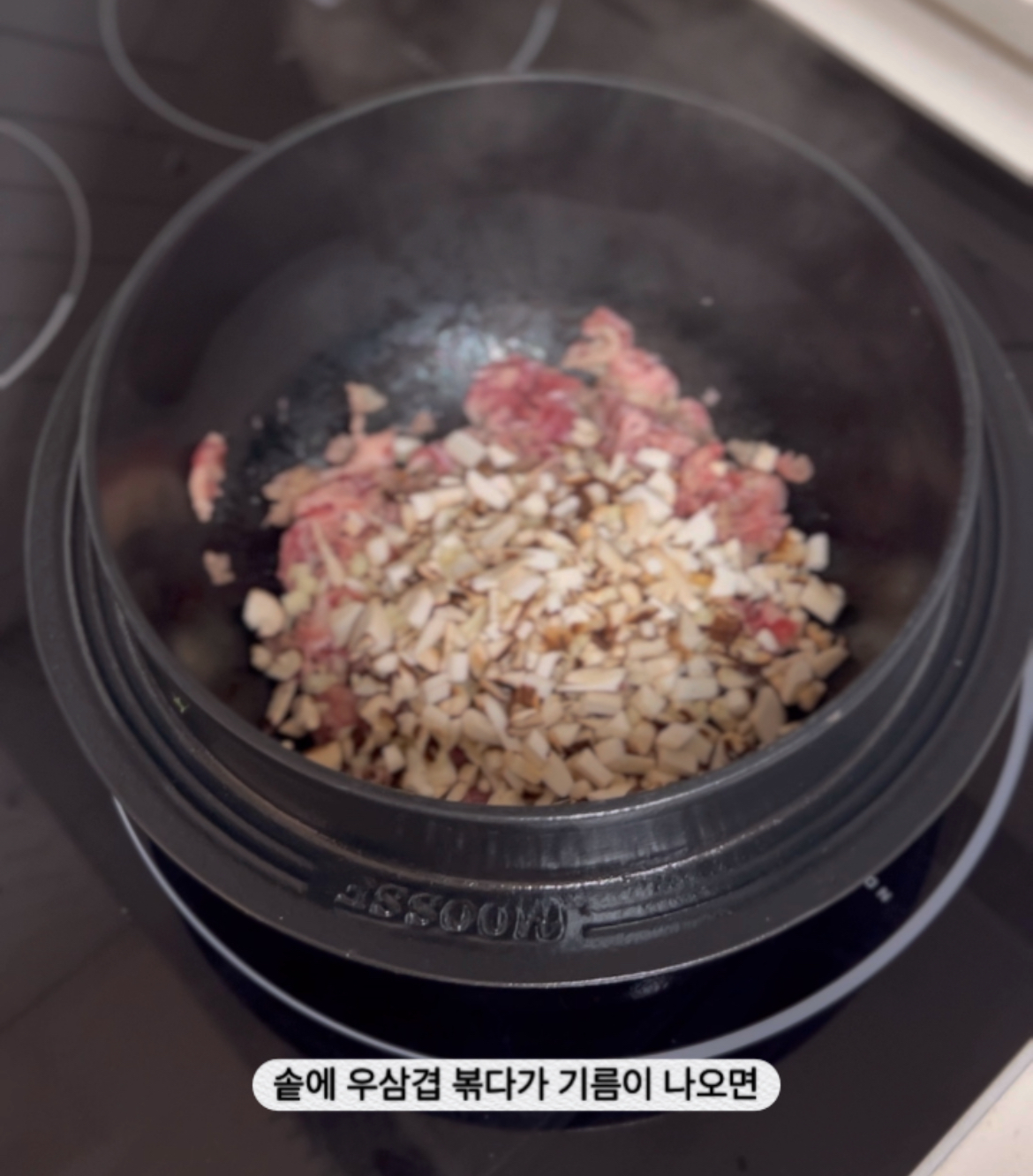 솥에 우삼겹 볶다가 기름이 나오면 마늘과 버섯 넣어 볶아줍니다