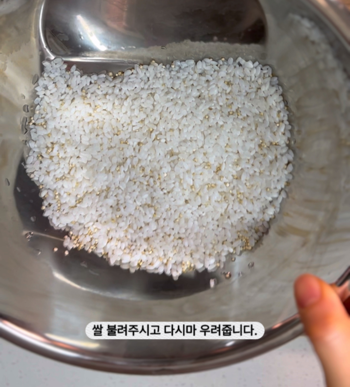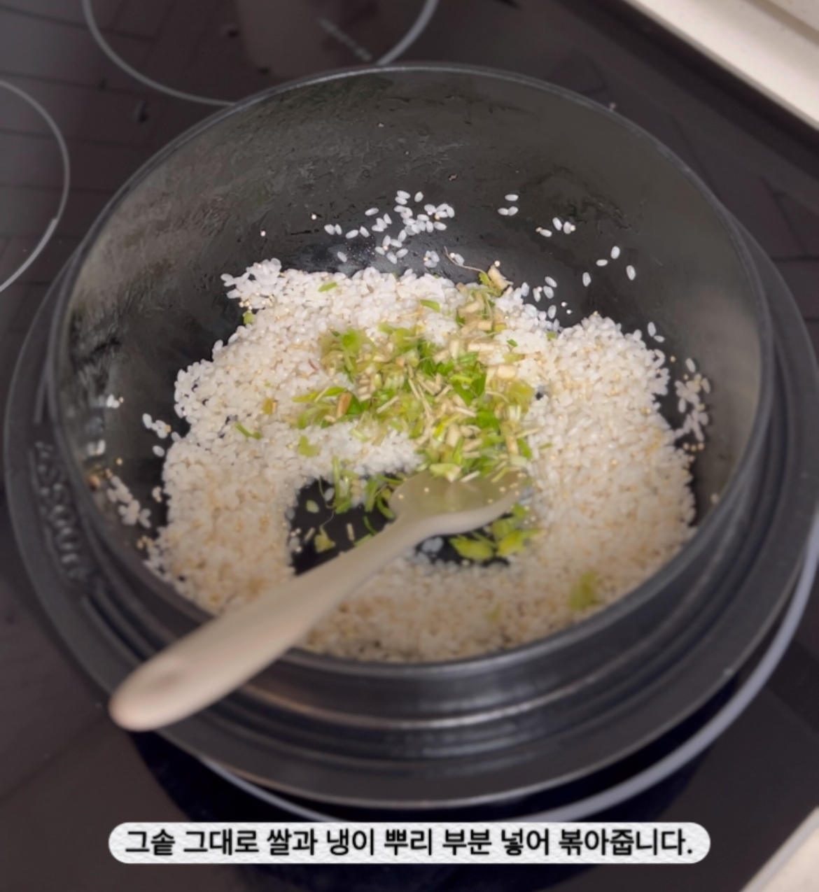 그솥 그대로 불린쌀과 냉이 뿌리부분 넣어 볶아줍니다