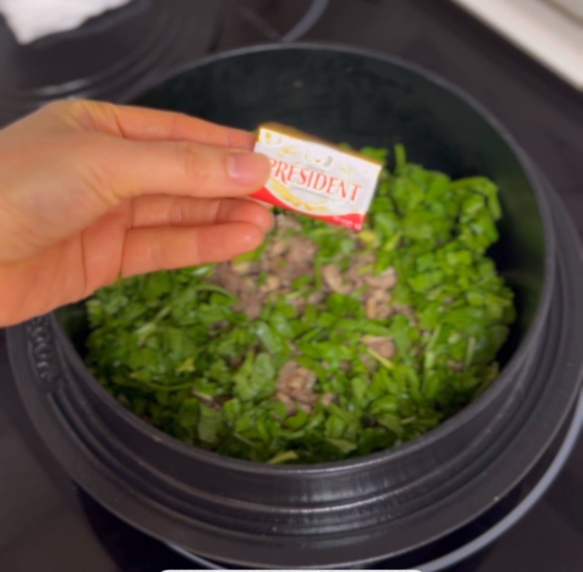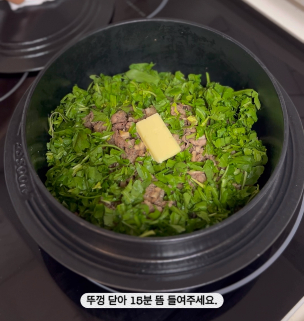 15분이 지나면 불끄고 다시마 건져내고 우삼겹, 냉이, 버터 한스푼 넣고 뚜껑닫아 15분 뜸 들여주세요