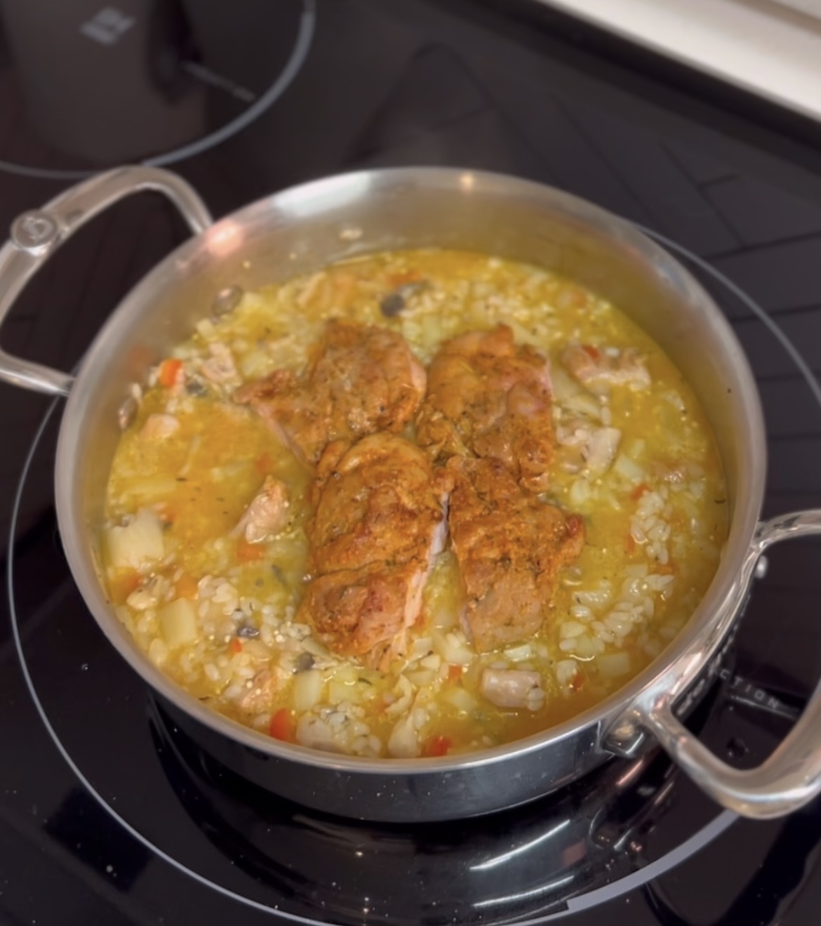 약불로 내려 닭다리살 올려주시고 뚜껑닫고 12분 익혀 줍니다