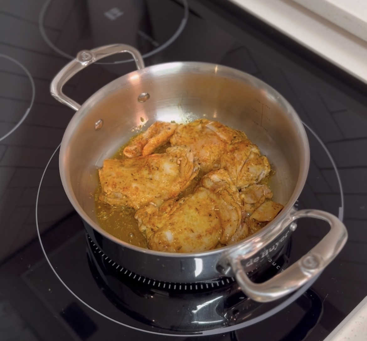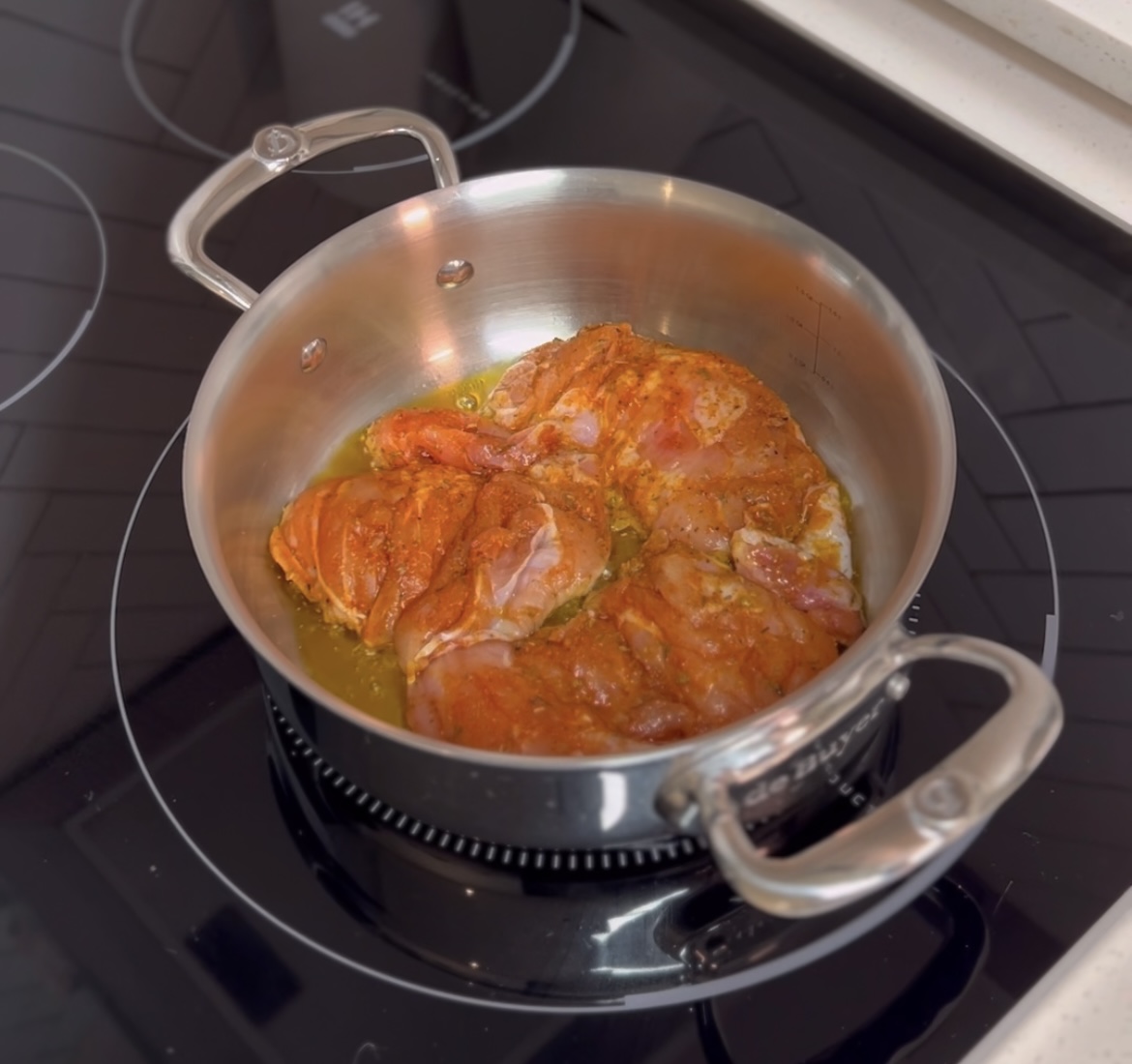 예열된 냄비에 올리브유 넉넉히 두르고 시즈닝 해 둔 닭다리살 먼저 구워줍니다.