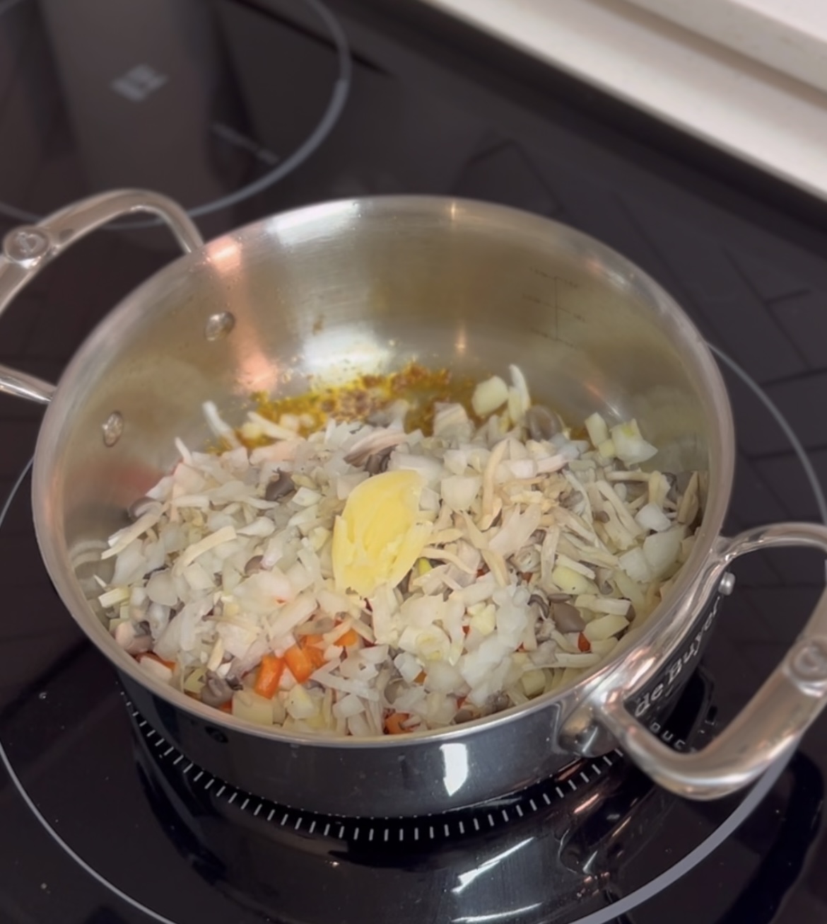 나머지 닭다리살도 팬에서 덜어주시고 그 팬 그대로 중약불에서 준비해둔 야채 재료에 기버터 한스푼 더해 볶아줍니다.