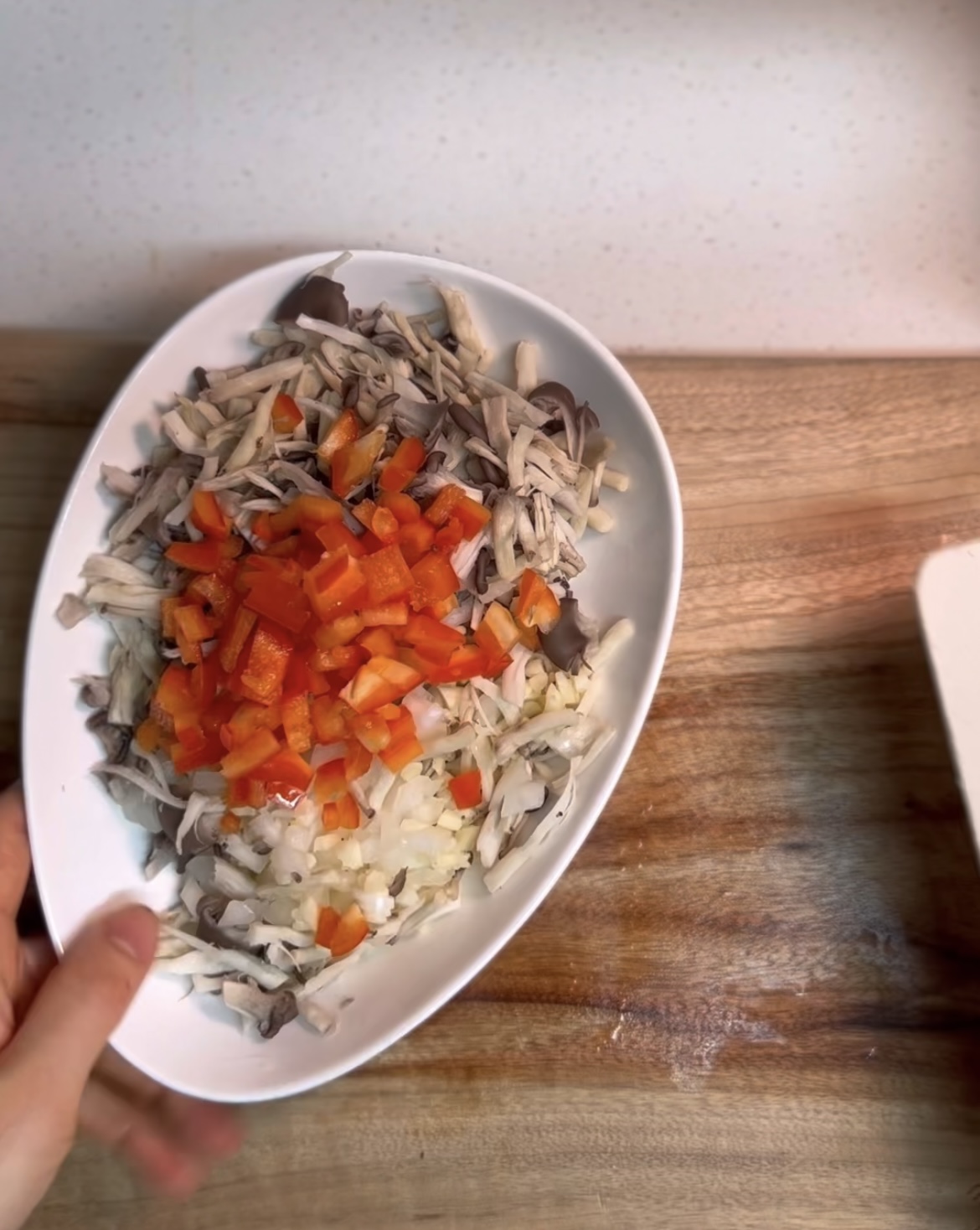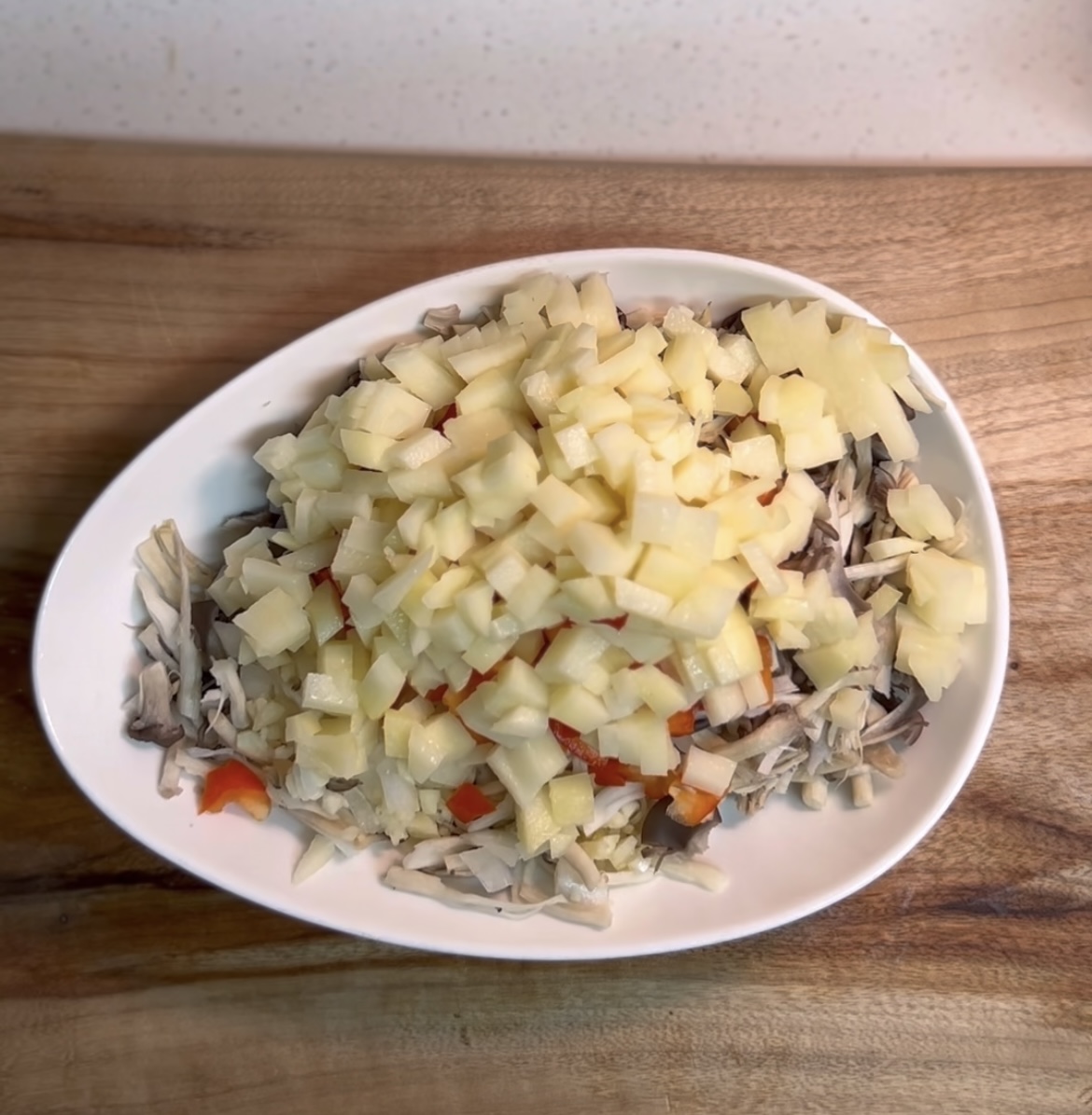 마늘, 양파, 버섯, 파프리카, 감자, 데코에 쓸 쪽파까지 잘게 잘라 준비해 주세요.