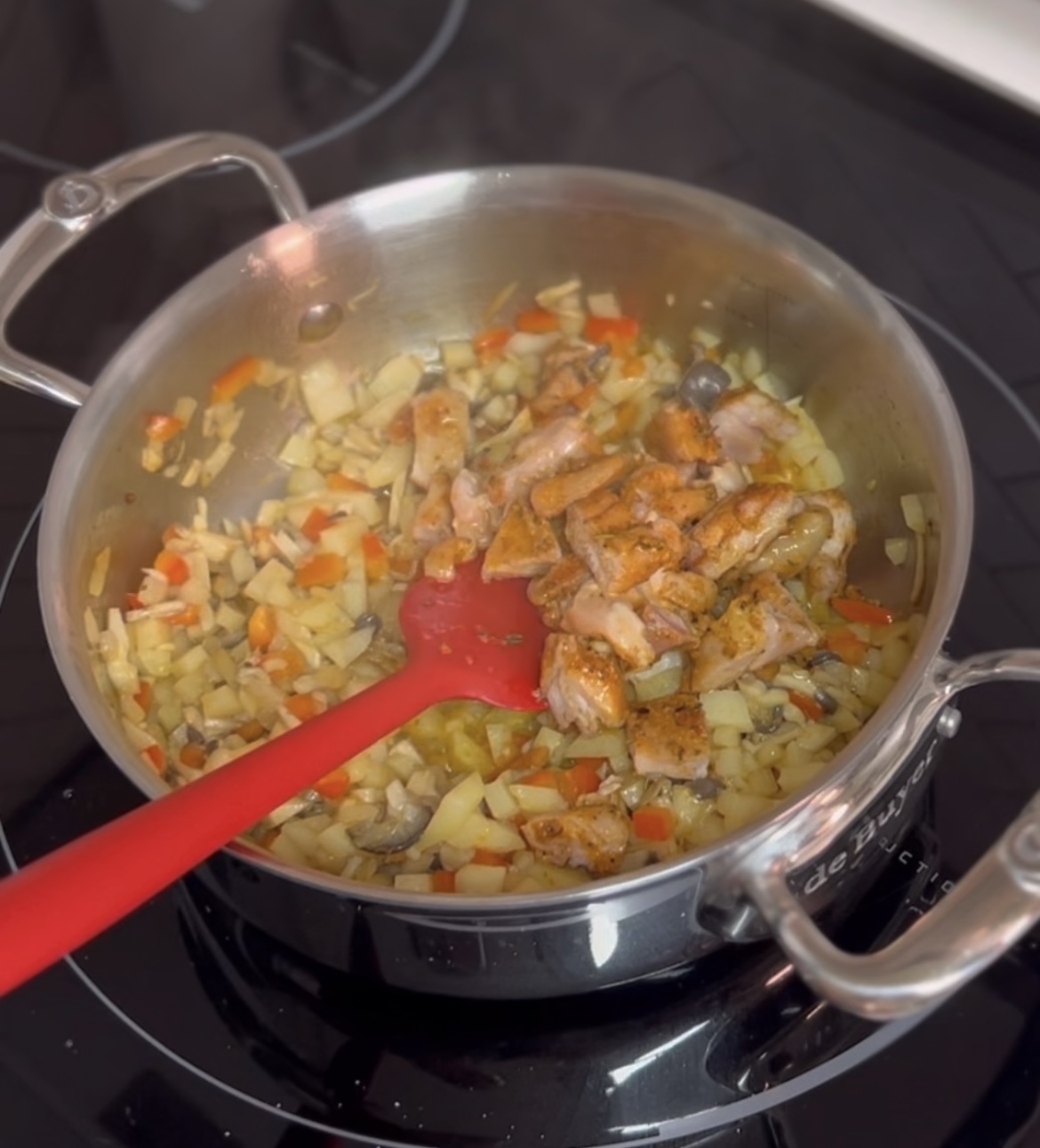 야채 수분이 나오기 시작하면 잘게 잘라준 닭다리살도 넣어 3분 더 볶아 주세요.