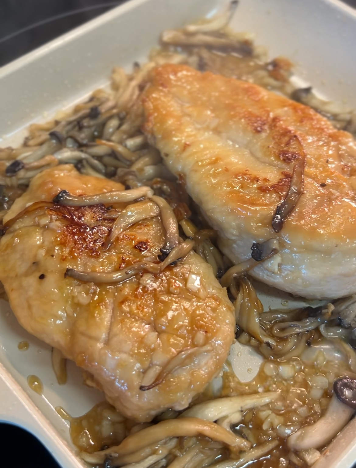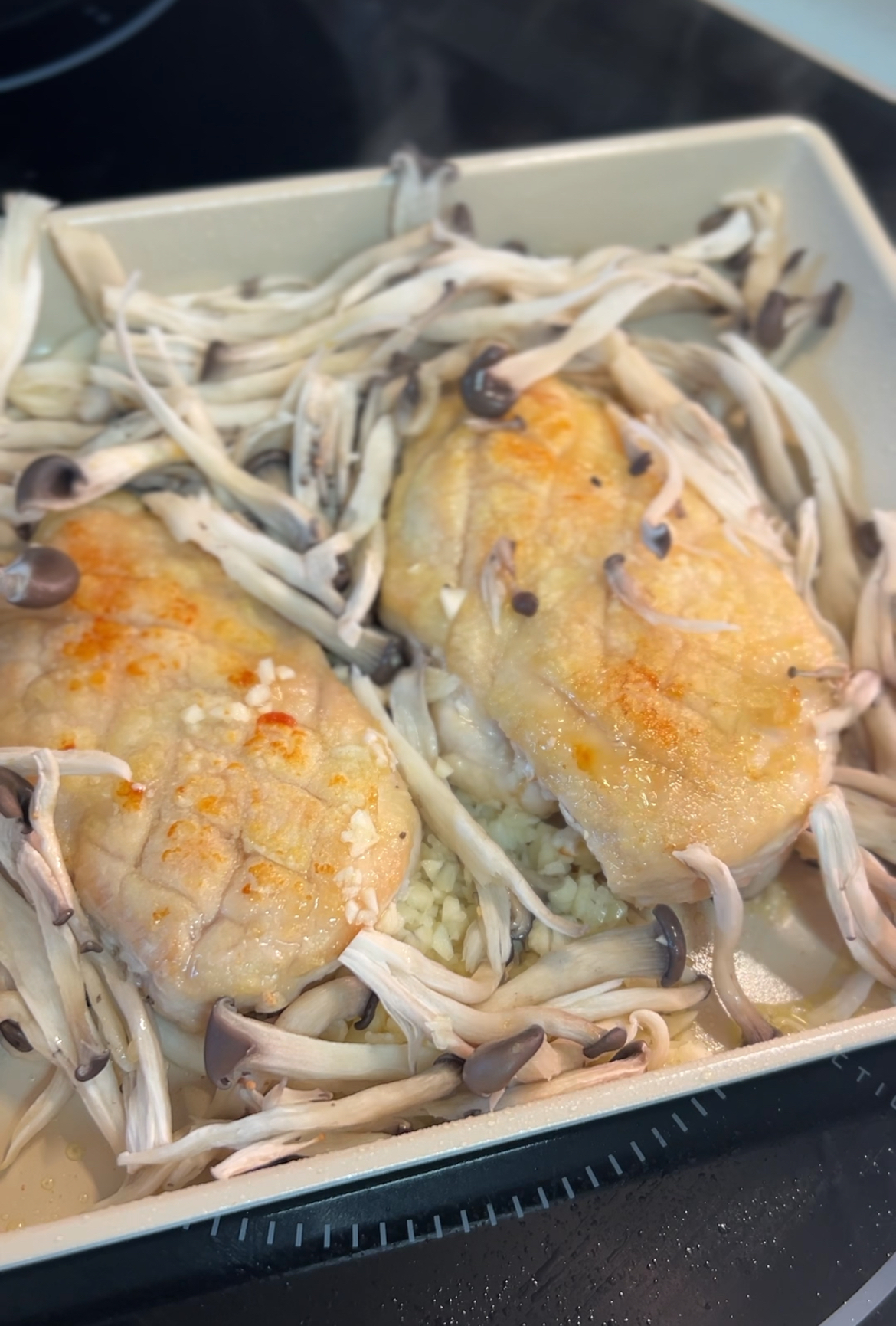 3. 80% 정도 익으면 다진 마늘, 버섯 넣고 함께 구워줍니다
