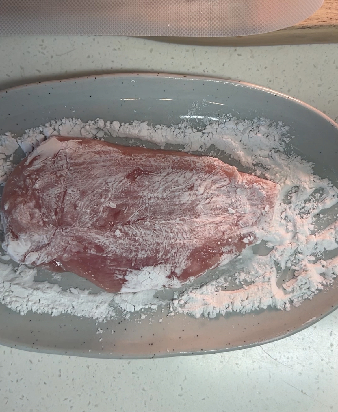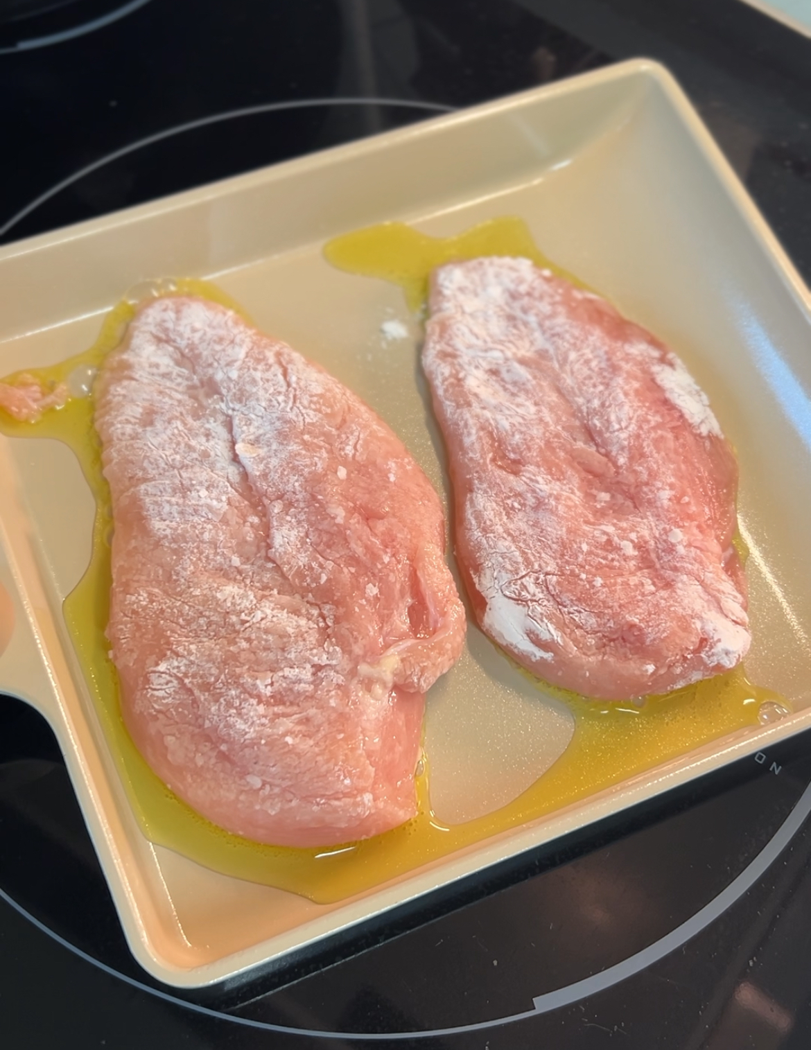 2. 전분가루 얇게 묻혀 올리브유 두른 팬에 구워주세요